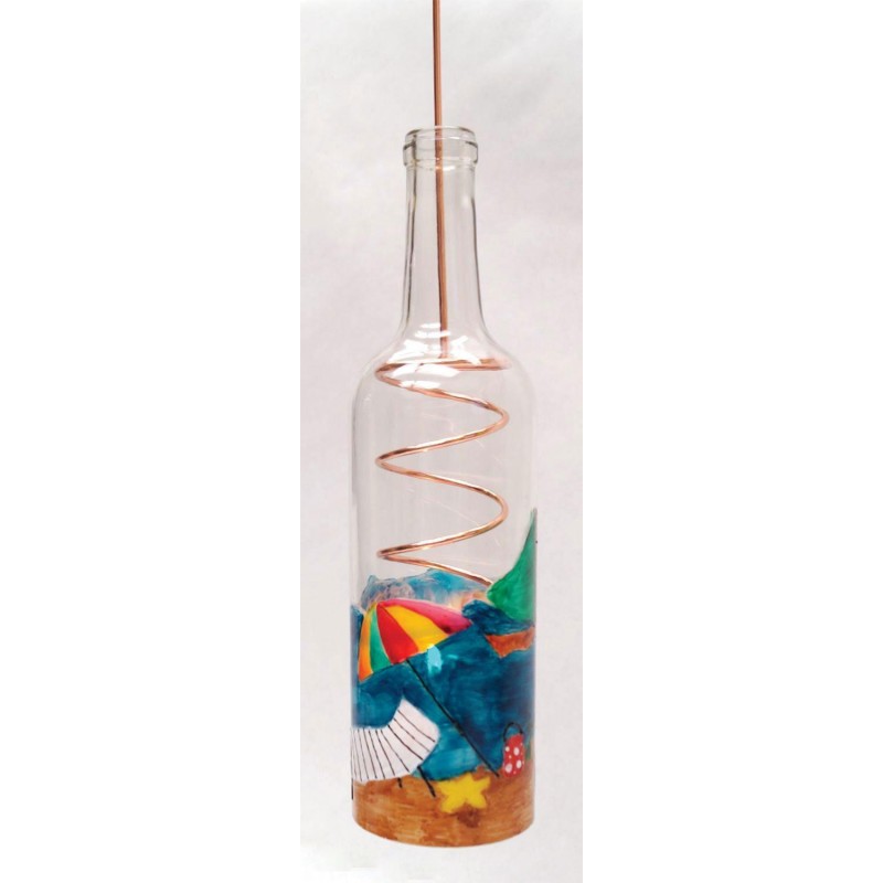 Cuelgue su botella artística con esta votiva colgante. Hecho de acero de grueso calibre y chapado en cobre, este fuerte colgante de 17" (43cm) incluye un pequeño vaso de vidrio y una vela de té.