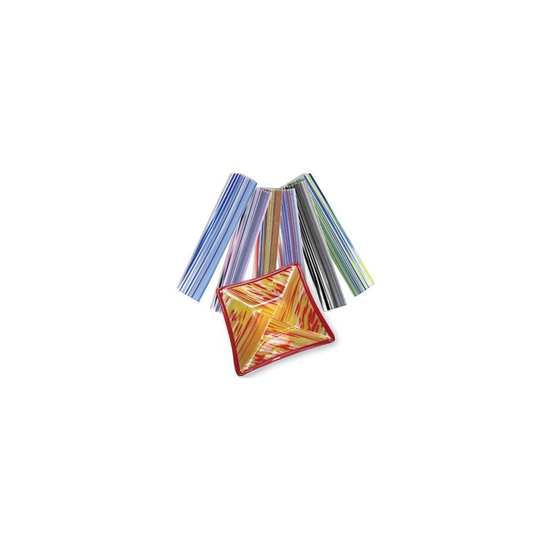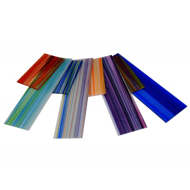 Cree diseños únicos de vitrofusión con estrías lineales elegantes de 3 o 4 codiciados colores que se producen de cada hoja de vidrio Spirit. Ideal para bordes/cenefas, los acentos, pulseras y otras obras de joyería. Cada paquete contiene 0.67 pies² (0.20m²) de vidrio, cortado en tiras de aproximadamente 2" x 8" (5x20cm) y/o 2" x 4"(5x10cm). 96 COE.