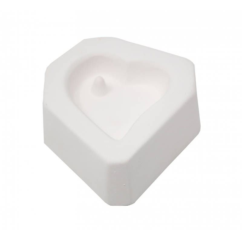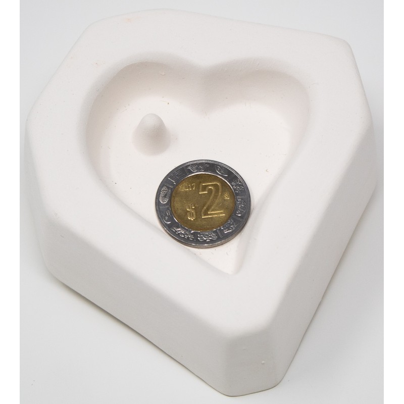 La pieza terminada mide aproximadamente 1-3/4" de ancho x 2-1/8" de largo (4.4 x 5.4cm). Los moldes de cerámica son muy duraderos y pueden ser utilizados muchas veces. Las medidas de todo el molde son aproximadamente de 3-1/4" x 3-1/2" x 1-1/2" de alto (8.2 x 8.9 x 3.8cm). El molde necesita aproximadamente 20 gramos de frita o pedacería de vidrio.